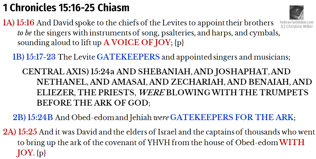 15:17b-25 {p} They appointed gatekeepers, singers, musicians, music master, and gatekeep-ers for the ark