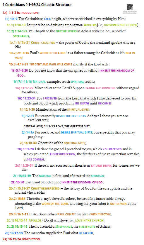 As we conclude the first letter to the Corinthians, I realized that the entire letter forms a single Chiastic Structure from beginning to end: