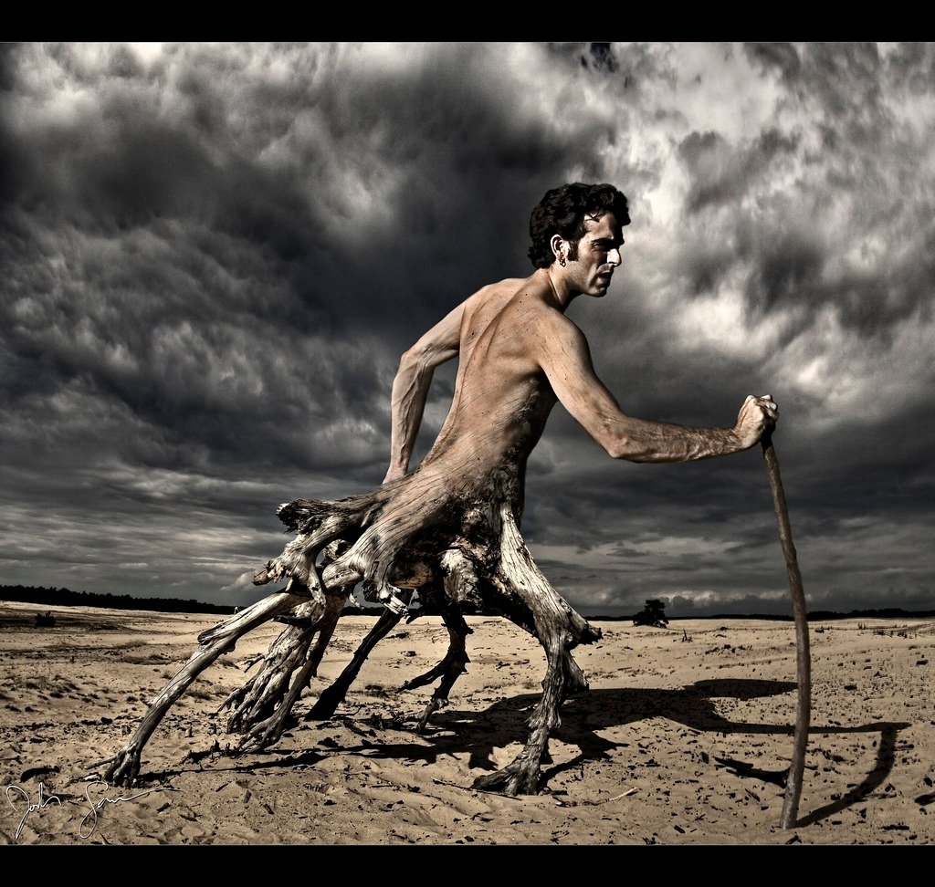 A man is trying to run, despite the fact that his lower body is a dead tree rooted into the ground.