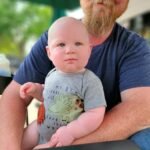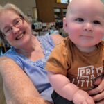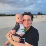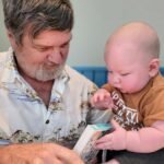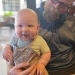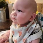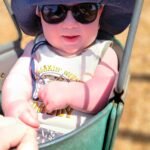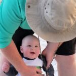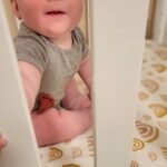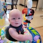 He has got four teeth now, two uppers and two lowers, is eating solid food, got a new crib, first trips to a restaurant, the beach, the park, and swimming pool, and has been practicing rocking on all fours, and standing with help. He also started saying da da da da da this month. He is growing so fast!