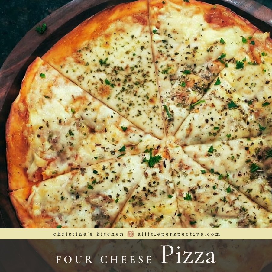 One recipe pizza dough makes two crusts. Whisk roasted garlic into olive oil. Layer on the unbaked crust, the garlic olive oil, cheeses, and basil. Bake at 500 for 10-12 minutes, or until crust is golden brown and cheese is bubbly.