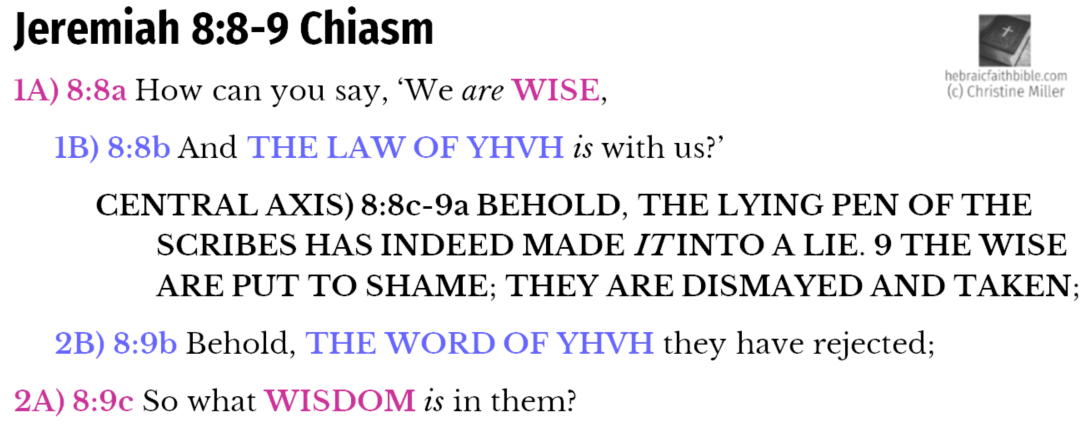 The scribes were Levites who copied the Torah scrolls, following a strict set of standards to ensure no mistake was made in even a jot or tittle (the smallest marks of the Hebrew letters). They were also teachers of the Law and wrote commentaries on the meaning of the Torah and its observance. YHVH charges them with a lying pen. Their pen did not lie in their scroll copying (Yeshua affirms the accuracy of the Law in Mat 5:18), but in their commentary. They taught the people that the Temple in Jerusalem as the place of God’s presence upon the ark of the covenant, meant ‘Peace, peace’—no disaster could befall the holy city. Therefore, the people (and the rulers, priests, scribes, and prophets) were strengthened in their wrongdoing.
