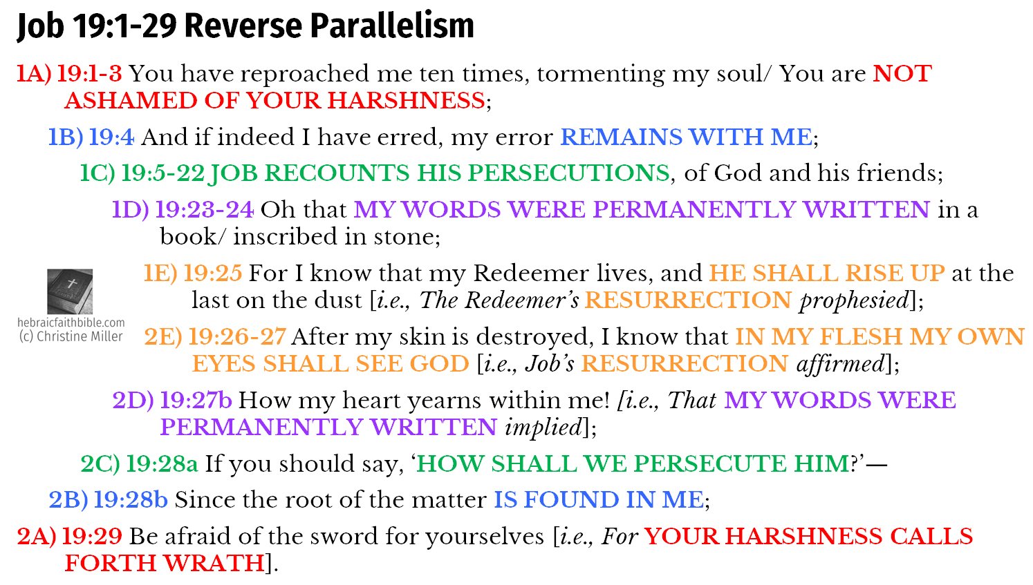 Job 18 is Bildad’s speech, which I cannot find a chiastic structure for. Job 19 is his reply to Bildad.