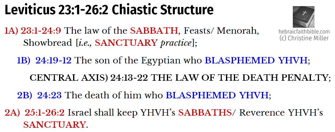 Surrounding the central axis is the B pair. Notice that the one who blasphemed had an Israelite mother but an Egyptian father. Why is this detail in Scripture? It is Scripture’s way of pointing out that this man was not of the children of Israel but of Egypt! Leaving aside for now the importance of fathers in passing the spiritual legacy and heritage to the next generation (Scripture says that the son does as he sees his father doing, not as he sees his mother doing), let us remember that Israel is a type of the family and children of God, the kingdom of heaven, while Egypt is a type of the children of the world and the kingdom of darkness! It was the son of an Egyptian who blasphemed the LORD and incurred death.