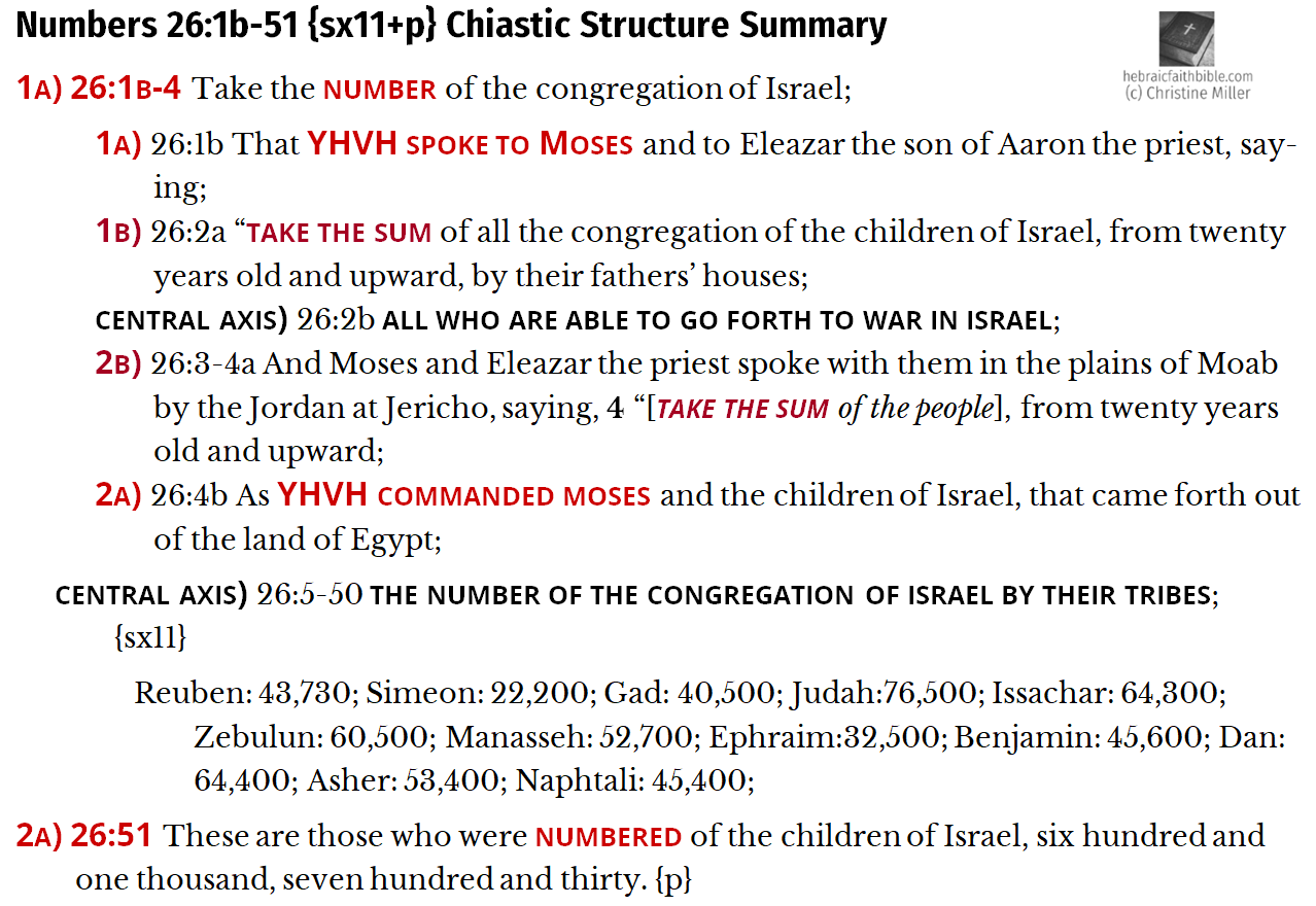 Even the small chiasm at the beginning (26:1b-4) has its own bull’s-eye: “all who are able to go forth to war in Israel.” The opening verses zero in that the new generation is a ready fighting force.