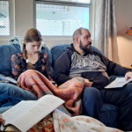 Lo key Sabbaths at the Miller’s. We sleep in, then put a breakfast casserole (prepared on Friday) in the oven. We eat, then worship with a You Tube playlist. The Elliotts are musical and do their own worship at home, but we aren’t. Then we read the Bible, and discuss, and pray together. Then we cook a previously prepared lunch, and eat together. And we rest, after a busy week of house construction!